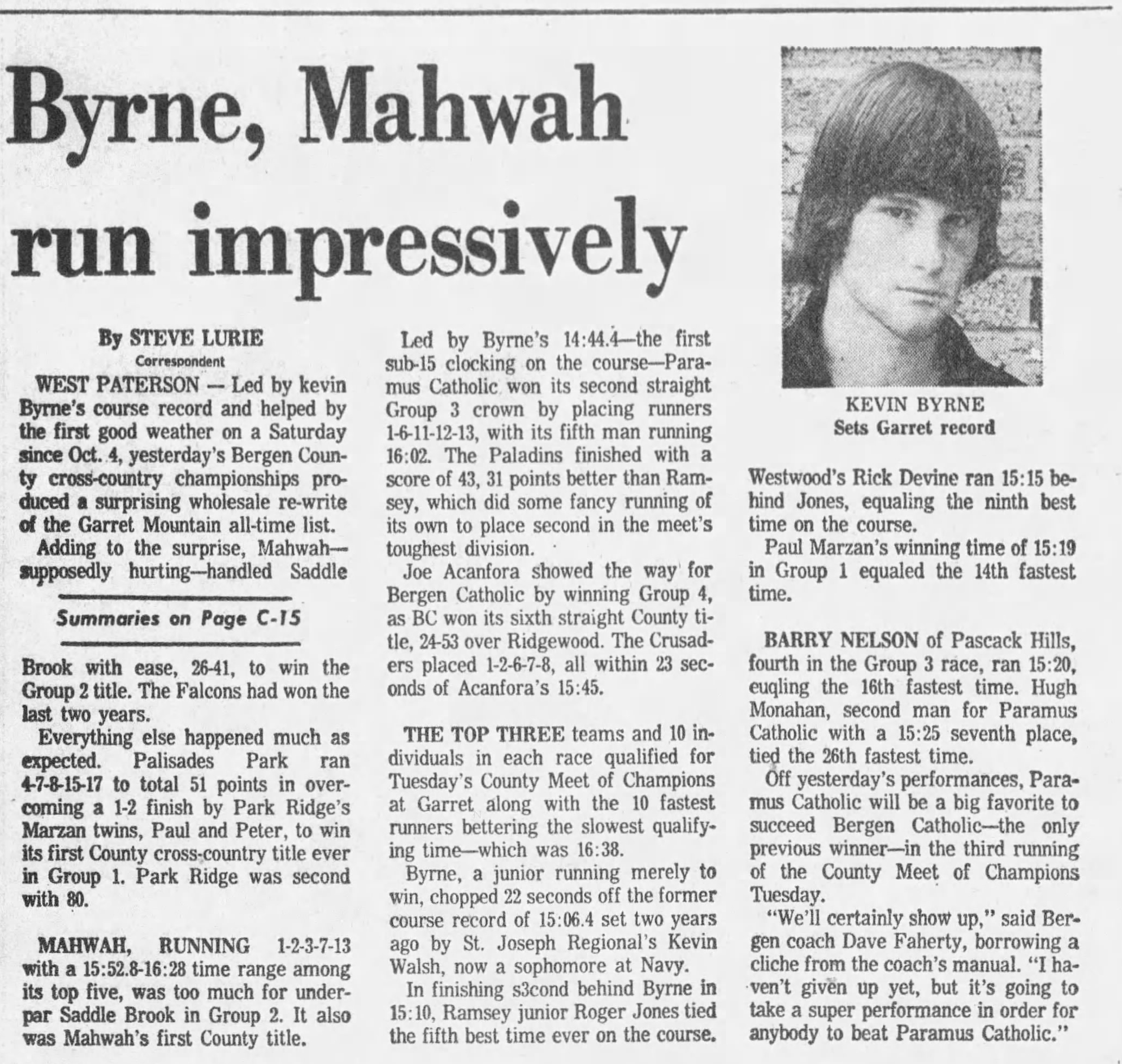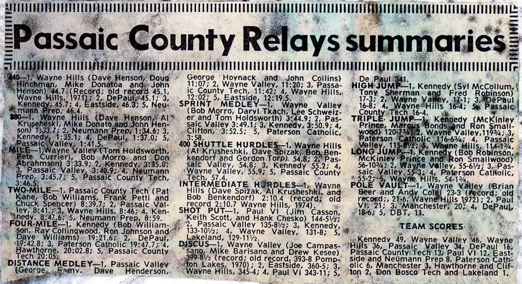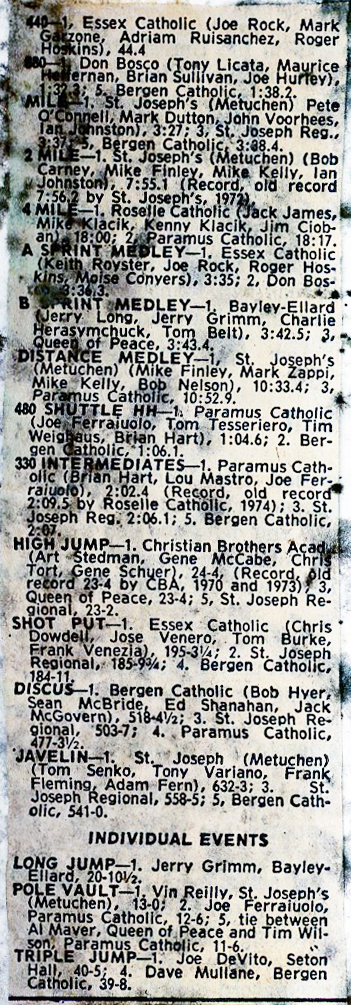 February 1975 Newark Distance Run Newark Distance Run - 2/16/1075 April 1975 Relays on April 5th North Bergen Relays * Pascack Hills Relays Relays on April 12th St. Joseph Relays, Nanuet Relays, Rutherford Relays, & Memorial Relays Bergen County Relays 5/19 Bergen County Relays Passaic County Relays 5/19 Passaic County Relays Penn Relays 5/26 Bergen County at Penn Relays Wayne Hills Relays 5/26 Wayne Hills Relays Rutherford Relays 4/26 Rutherford Relays - Girls Bergen Dual Meets Bergen Dual Meets May 1975 Englewood Memorial Meet 5/3 Englewood Memorial Meet New York Relays 5/3 New York Relays Bergen Group Champs -Boys 5/10 Bergen Group Championship - Boys Long Branch Relays 5/10 Long Branch Relays Catholic Track Conference Catholic Track Conference - Relays League Meets - 5/17 BCSL Champs * BPSL Champs * NNJIL & NBIL & BCSL & Big 5 & Hudson County NJ Sectional Champs - Girls NJ State Sectional Championship Results - Girls Bergen Meet of Champs - Boys BMOC - Boys 5/21 Bergen Frosh Champs - Boys Freshmen Champs 5/223 NJ Sectional Champs - Boys North 1 Sectional Champs - Boys Catholic Track Conference Catholic Track Conference - Championship Bergen Champs - Girls 5/27 Bergen County Championship Results - Girls New Jersey Relays - 5/27 New Jersey Relays at Metuchen HS North Jersey Soph Champs North Jersey Sophomore Champs Twin Boro Relays - 5/28 Twin Boro Relays at Has.Hts. NJ Group Champs - Boys 5/31 NJ Group Championship at Rutgers - Boys NJ Group Champs - Girls 5/31 NJ Group Championship at Holmdel HS Results - Girls June 1975 Bergen Demi-Decatholon - 6/5 Bergen Demi-Decathlon SMOC-6/7/1975 NJ State Meet of Champions Meet Preview by Ed Grant * Boys Meet Program * Girls Meet Program All League & County All League Selections * All County Selections News Paper Articles 1975 NewsPapers: Spring Track & Field - 1975 * Paul Schwartz's Scrapbook Ridgewood Girls Track Booklet 1975 Ridgewood Girl's Track Seasonal Booklet September 1975 October 1975 Bergen Dual Meets Dual Meet Results Shore Coaches Invite 10/4 Shore Coaches Results Iona Invite 10/4 Iona Results League Meets 10/23 & 10/24 NNJIL Results * BCSL & NBIL Results * BPSL Results * CC Article - Nelson November 1975 Bergen Group Champs 11/1 Boy's Results * Girl's Results * Article Bergen Meet of Champs 11/4 BMOC Results Hudson County Champs 11/4 Hudson Champs Results Met Champs Met Champs Results (College) NJ Sectionals 11/8 Boys North Section Results * * Girl's Section 1 Results * NJCTC Results * Article NJ Groups 11/15 NJ CC Group Results * Boy's Article * Girl's Article New Jersey Meet of Champs SMOC Results Ridgewood Girls CC Booklet 1975 Cross Country Booklet