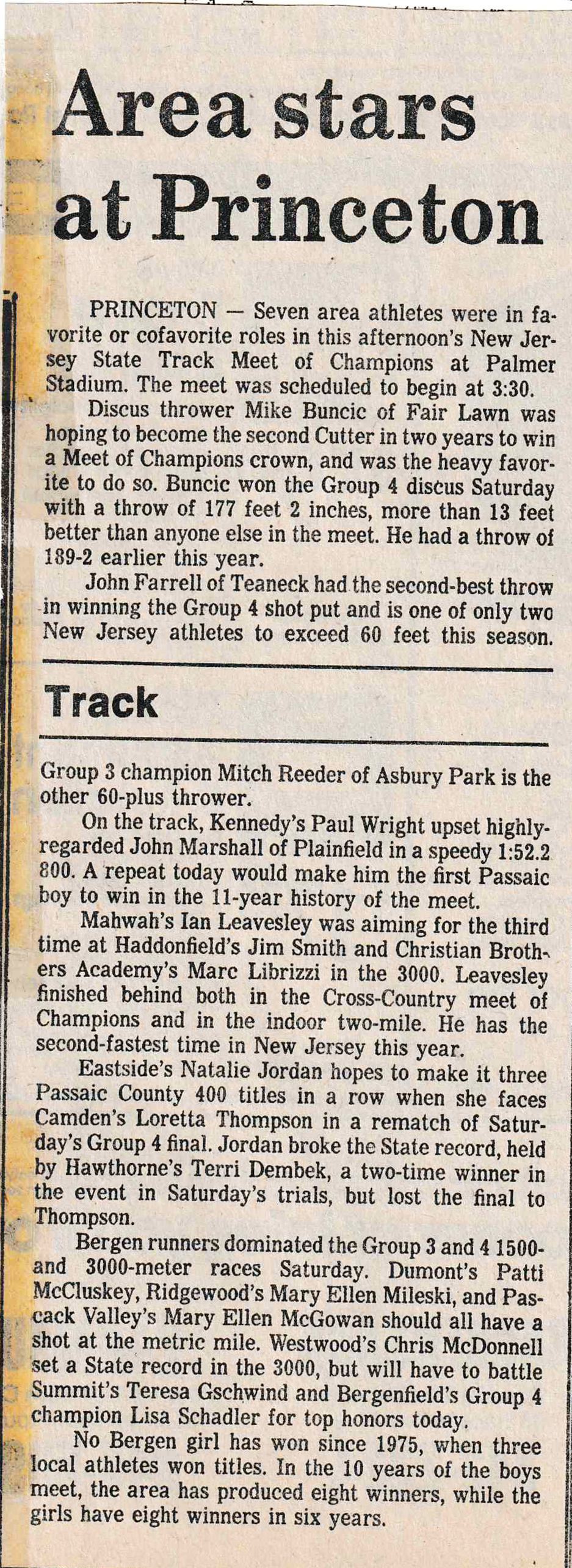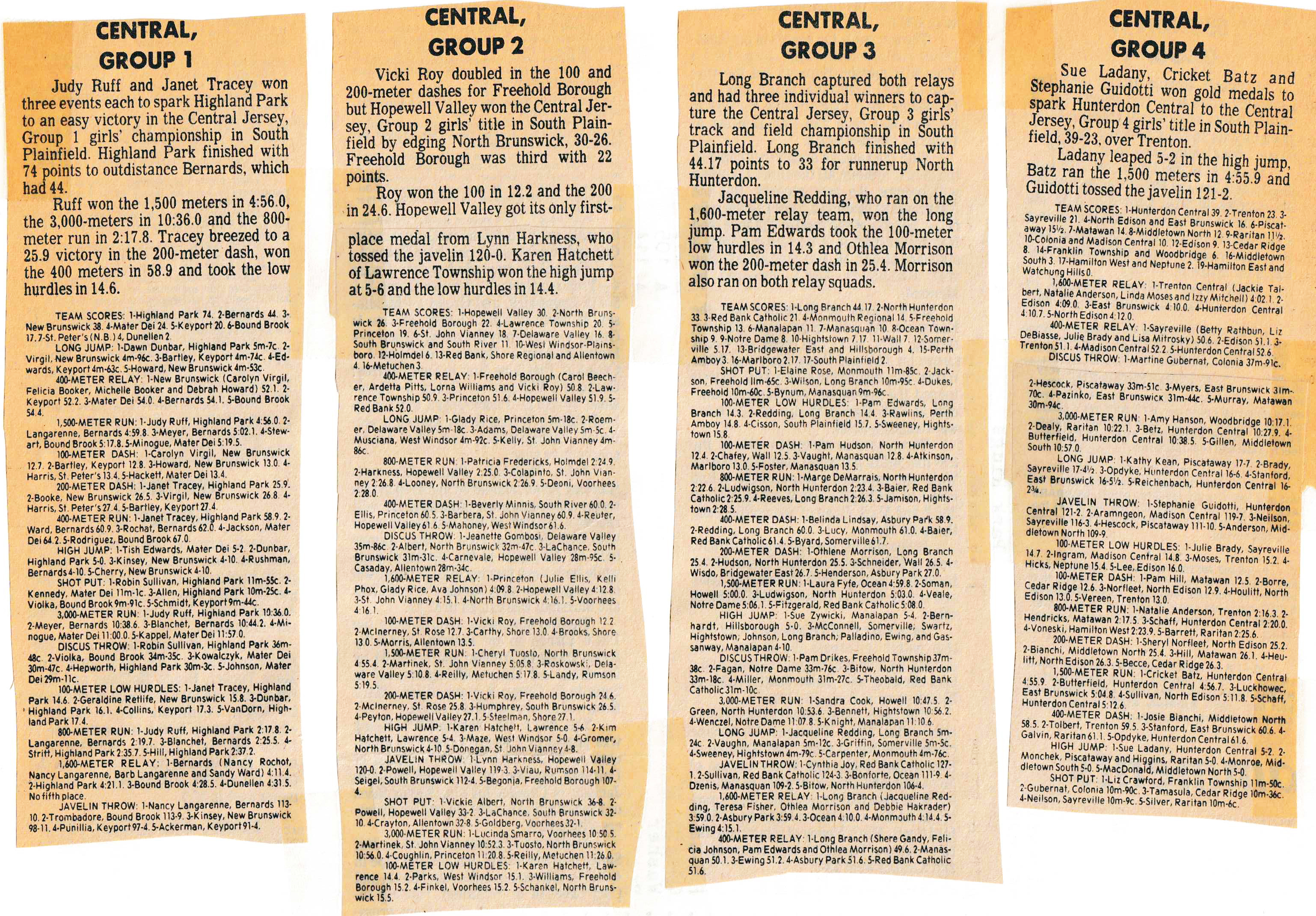 Spring Track & Field: April 1980 May 1980 Bernards Invitational Bernards Invitational Englewood Memorial Meet Englewood Memorial Bergen Relays - Girls Bergen Relays - Girls Bergen Group Champs - Boys Bergen Group Champs - Boys League Meets Various League Meet Results Passaic Champs - Boys Passaic County Champs - Boys Bergen Meet of Champs - Boys BMOC - Boys NJ State Sectional Champs N1-Girls * N1-Boys * N2-Girls * Central-Girls * South-Girls * Article in Record Bergen Meet of Champs - Girls BMOC-Girls * BMOC-Article in Record NJ State Group Meet Champs New Jersey State Group Champs-Girls * New Jersey State Group Champs-Boys * Article in Record * Article in Record June 1980 NJ SMOC NJ SMOC * Preview Article * Summary Article Track & Field Newspaper Articles Cross Country: September 1980 Passaic Invitation Passaic Invitation October 1980 Ridgewood Invitational Ridgewood Invitation * Official Results Skyline Meet Skyline Meet Essex Catholic Invite EssexCatholicInvite - 10/18 Turkey Trot TurkeyTrot Cumberland Run Cumberland Run NNJIL Championship NNJIL Championship League Meet Results Various Results November 1980 Bergen Group Championship Bergen Group Championship Passaic County Championship Passaic County Championship Bergen Meet Of Champs Bergen Meet Of Champs North 1 Section - Girls North 1 Section - Girls New Jersey Sectionals New Jersey Sectionals - Complete North Jersey non-qualifier North Jersey non-qualifier New Jersey Group Champs New Jersey Group Champs NJ SMOC New Jersey SMOC Cross Country Newspaper Articles Ridgewood Girl's Cross Country Results Booklet - 1980