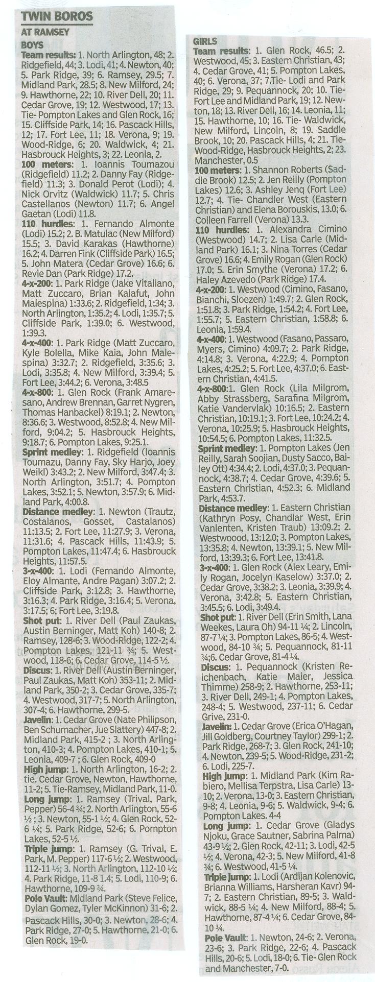 January 2012: Tom Zaccone Intitational Zaccone RESULTS North Jersey Championship North Jersey RESULTS Ridgewood Winter Track Booklet 2012 Ridgewood Winter Track & Field Seasonal Booklet March 2012: Kearny Relays - March 31 Kearny RESULTS Pawlowski Relays - March 31 Pawlowski RESULTS Season Opener - March 31 Opener RESULTS April 2012: Highlander Relays - April 7 Highlander RESULTS Lyndhurst Relays - April 7 Lyndhurst RESULTS Avaiator Relays - April13 Avaiator RESULTS Comet Relays - April 14 Comet RESULTS Passaic Co. Relays - April 14 Passaic Co Relays Skyland Conference - April 14 Skyland Conference Bergen County Relays - Apr 21 Bergen Boys RESULTS *** Bergen Girls RESULTS Twin Boro Relays - April 28 Twin Boro RESULTS May 2012: Ironman Invitation - May 3 Iron Man RESULTS County Seat Meet - May 5 County Seat RESULTS NJIC Champs - May 8 NJIC RESULTS Big North Champs - May 9 Big North RESULTS Big North Champs - May 10 Big North RESULTS Passaic County Champs-May 17 Passaic County RESULTS Bergen Group Champs - May 19 Bergen Group RESULTS-Boys *** Bergen Group RESULTS-Girls NJ N1 Champs - May 26 NJ N1 RESULTS BMOC - May 29 BMOC RESULTS June 2012: NJ Group Championship NJ Groups - 1page *** NJ Groups - 4pages State Meet of Champs Ridgewood Boy's Track Booklet 2012 Ridgewood Boys's Track & Field Seasonal Booklet July 2012: Article in Missourian about My College Coach: John Lucas September 2012: Maroon CC Invitational Maroon CC RESULTS Passaic Coaches Invitational Passaic CC Coaches RESULTS Stewart Memorial Invitational Stewart Memorial CC RESULTS Wild Safari Invitational Wild Safari CC RESULTS
